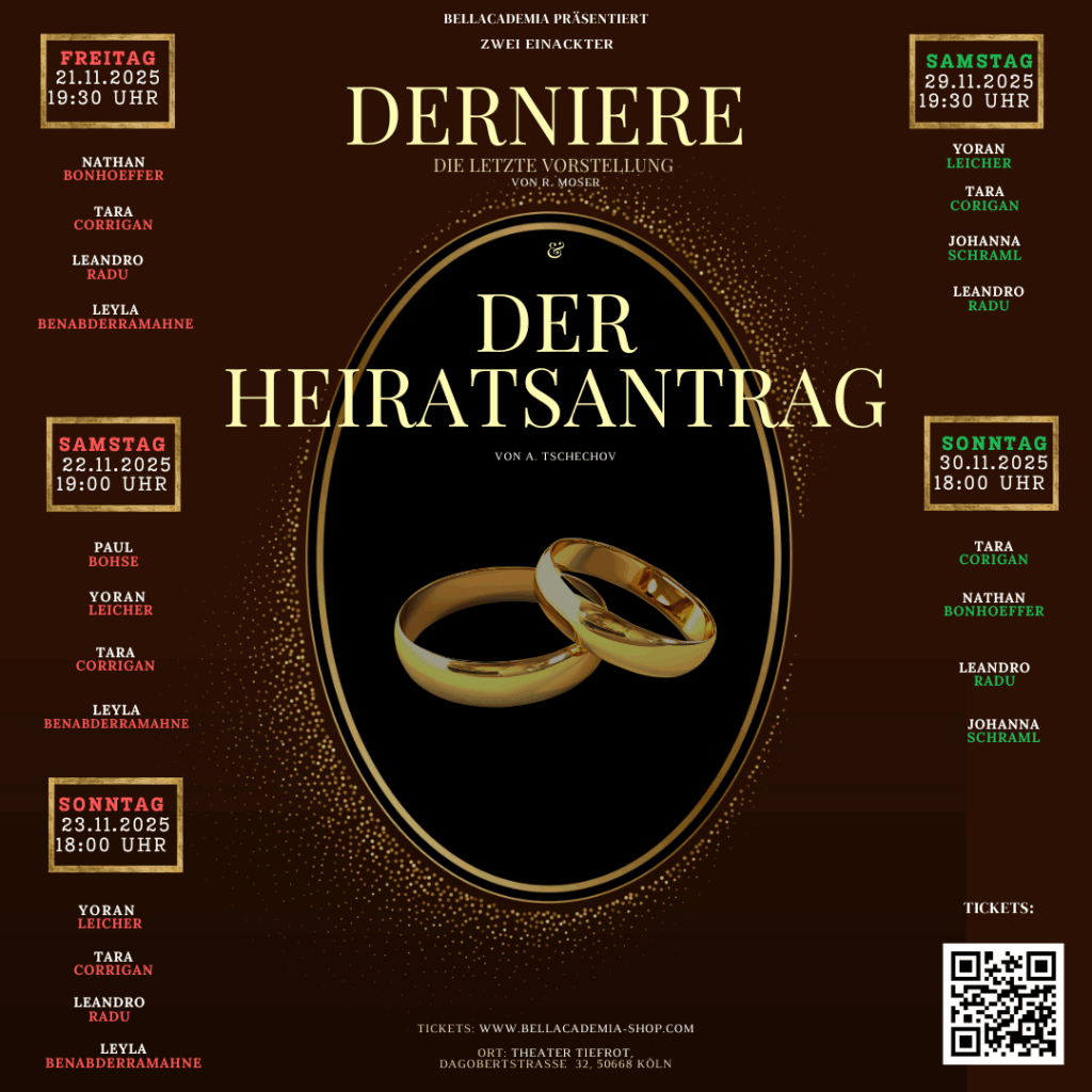 Ein Theaterdirektor steht kurz vor dem Ruin – da kommt das rettende Angebot: die „Russischen Wochen“ mit Anton Tschechovs Klassiker Der Heiratsantrag. Doch beim Vorsprechen melden sich nur drei Schauspieler … und was für welche! Von da an ist nichts mehr sicher – weder das Stück, noch die Nerven des Direktors. Erleben Sie, wie sich der Probenwahnsinn steigert, Egos aufeinanderprallen und Theaterträume wanken – bis schließlich “ Der Heiratsantrag“ tatsächlich auf die Bühne kommt.